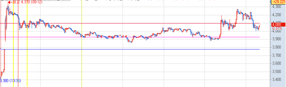 [핀포인트뉴스 이경선 기자] 범양건영 주가가 눈에 띄게 상승하고 있다.29일 한국거래소에 따르면 전 거래일 16.26% 올라 4325원에 거래를 마감했다.주가는 하락추세에서 급상승 반전을 노리고 있