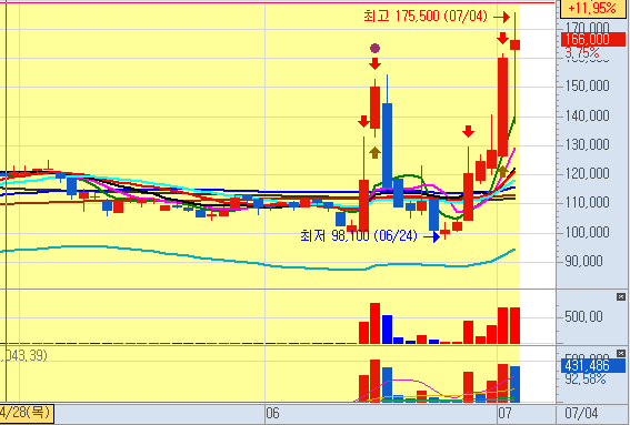 [핀포인트뉴스 이경선 기자] 조선선재 주가가 고공행진을 하고 있다.4일 한국거래소에 따르면 전 거래일 24.51% 올라 16만원에 거래를 마감했다.주가는 숨고르기를 마친후 5거래일 연속 상승랠리
