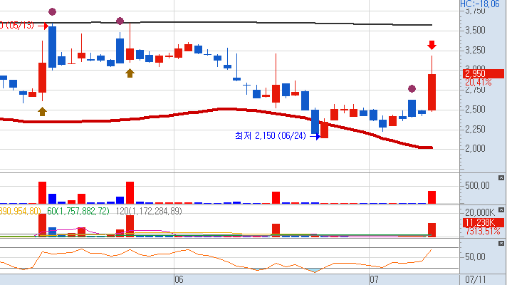 7월 11일 장 초반 대원화성 주가가 초강세를 보여 눈길을 끈다. 장중 상한가를 기록한 대원화성은 오전 11시 35분 기준 전장 대비 23.06% 급등한 3015원에 거래 중이다. 지난 7월 7일부터 3거래일 연속