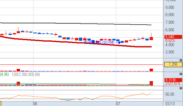 [이코노뉴스=이혜경 기자] 룽투코리아가 급등 중이다.룽투코리아는 13일 코스닥 시장에서 낮 12시55분 현재 전 거래일 대비 11.85%(550원) 상승한 5190원에 거래되고 있다. 이 회사는 5일부터 11일까지