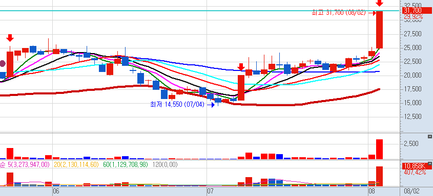 5. 웰크론한텍 : 시가총액 858억, 거래대금 406억