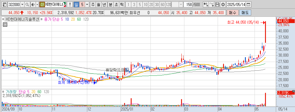 美 IRA 수정발의로 재생에너지 정책 리스크 해소 및 이재명 더불어민주당 대선 후보 재생에너지 공약 수혜 기대감 등에 태양광에너지 테마 상승 속 급등