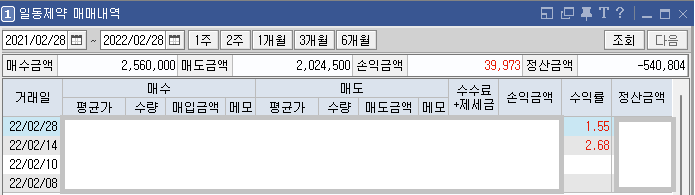| 2022년 2월 1일 ~ 28일 매매 수익 정리 (1) | 2022.02.28 |
