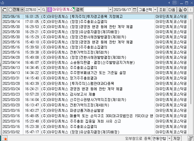 주식 일기/관심 종목 아우딘퓨처스 Fleks 2023. 6. 17. 10:56 728x90 반응형 2023년 6월 19일 관심 종목 #아우딘퓨쳐스 #다산네트웍스 #동국홀딩스 #파멥신 #CBI #샘표식품 #동국제강 #백광산업 #삼영이엔씨 #대아티아이 #케어젠 "이 포스팅은 파트너스 활동의 일환으로, 이에 따른 일정액의 수수료를 fleksmoney.com 반응형 저작자표시 (새창열림)
