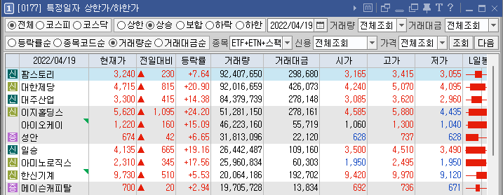 | 이지홀딩스 | 2,781 | 3,661 | 러시아-우크라이나 전쟁 장기화에 따른 곡물값 급등 지속 등에 사료 테마 상승 속 급등 |