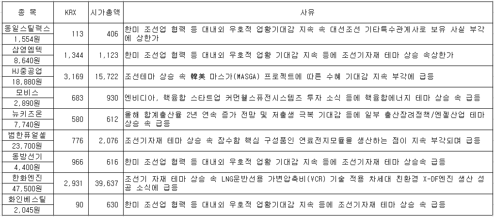삼영엠텍 2025년 9월 1일 시가 4.40%, 고가 15.05% HJ중공업 2025년 9월 1일 시가 3.28% 한화엔진 2025년...