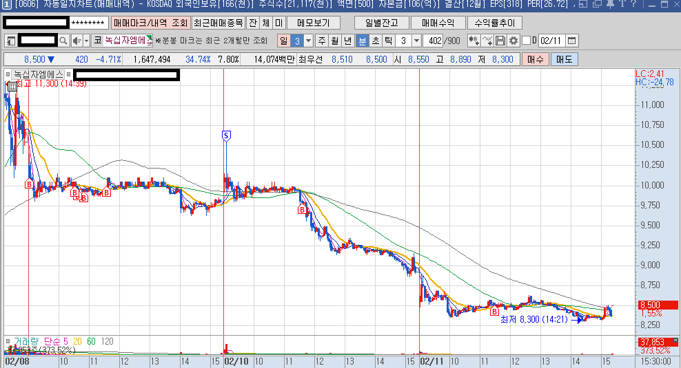 분봉과 이동평균선의 상반된 모습에서
